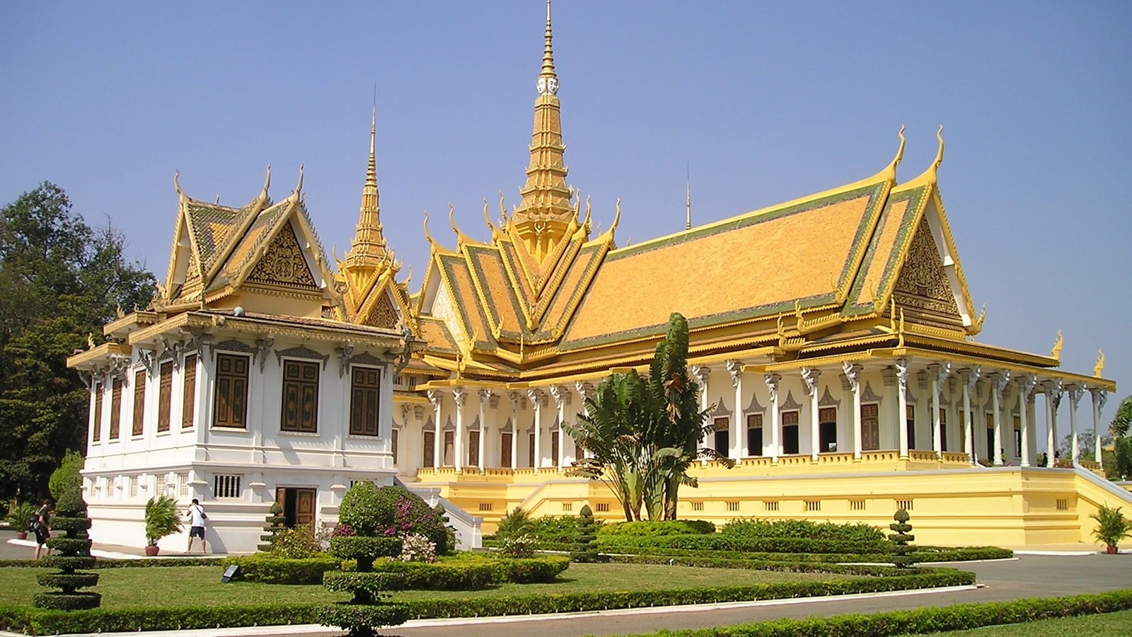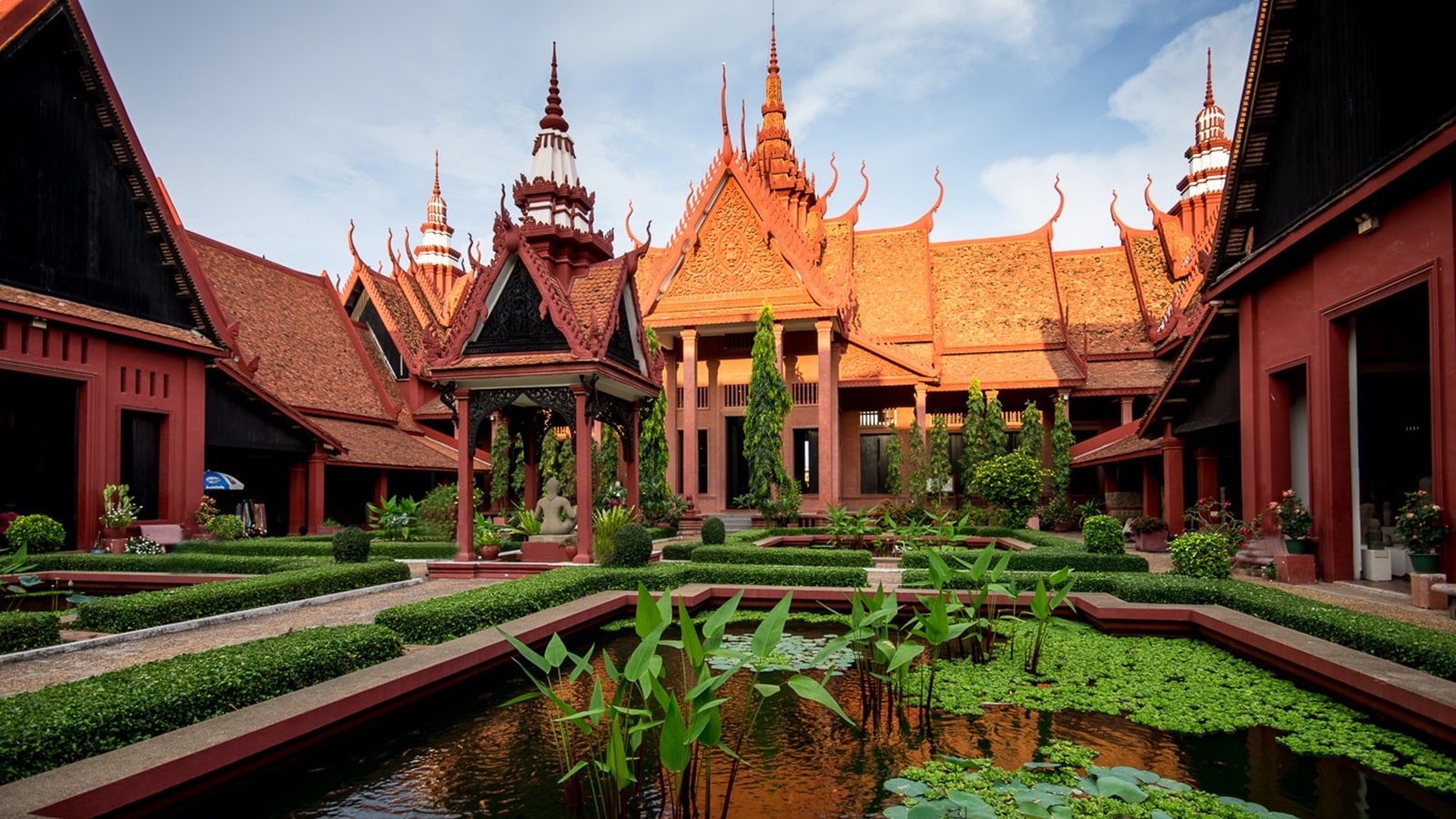 We then head to the north of the Royal Palace grounds to visit the National Museum. Built in a Khmer style between 1917 and 1920 by a French architect, this terracotta building has a welcoming courtyard and the most important artefacts and sculptures from the Angkor era and before. This includes an eight-armed statue of the god of Vishnu found at Phnom Da and a giant pair of wrestling monkey from the Angkor collection. Other exhibits include a wooden barge, and bronze and pottery from the Funan and Chenla, Indravarman and Angkor periods.
